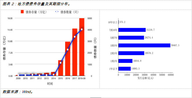 随着2014年预算法修正以及国发【2014】43号文出台,2015年以来的地方政府债券发行规模大幅上升。截至到2018年9月底,地方债的存量是18万亿、共4015只。地方债的平均剩余年限是4.6年。