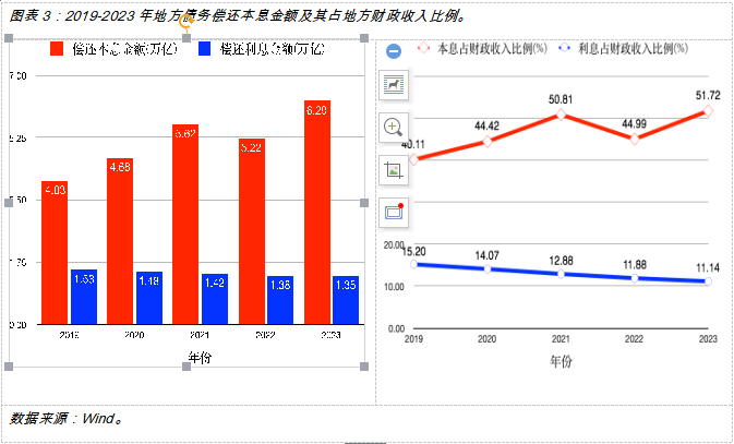 从估算结果可以看出,2021、2023年将是地方政府还债压力最大的时候。在2021年,地方政府需要还本付息5.62万亿,占地方财政收入的51%。也就是说,地方政府需要拿出一半的财政收入来偿还地方债务。对于财政收入只够支付日常“柴米油盐”开支的地方政府来说,如何才能够支付偿还如此巨额的债务本息呢?2023年的情形也是类似的。单就利息来说,城投债逐步被置换成地方债确实为地方政府节省了很大一笔利息支出,但地方政府每年需要支付的利息也在1.4万亿左右,大约占地方财政收入的13%。对于很多地方政府来说,不要说偿还本金了,利息都不一定负担得起。