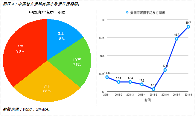 美国发行的市政债,既有1年以内的短期票据,也有期限在1年至30年的中长期债券。而中长期债券的期限又以 15至20年为主。据 SIFMA 数据,2017年美国市政债的平均发行期限是17.5年。 2018年1-6月,美国市政债的平均发行期限在17.5年左右,而7、8月的平均发行期限分别是19.2、19.7年。