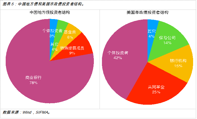 美国市政债的投资者结构更加分散。从2017年底的数据来看,持有比例最高的是个体投资者的42%。共同基金持有25%,而银行与保险公司持有量相当,分别为15%、14%。