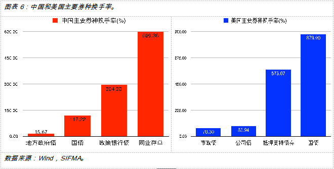 我们通过前三个季度的交易量数据估算出我国主要券种在2018年的年换手率。地方债的换手率只有16%,远远低于同业存单的599%和政策银行债的294%,也低于国债的117%。