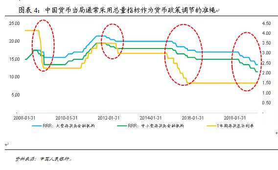 在中国,政策制定者通常采用“量”作为货币政策调节的准绳,特别是本轮经济周期中表现得更为明显。2018年美联储整体货币政策仍然呈现收紧态势,加息节奏并未明显放缓,在资本外流的压力下,中国央行通过利率宽松的政策空间被大大限制,因此主要通过货币总量供给的相关指标逆周期调节经济。