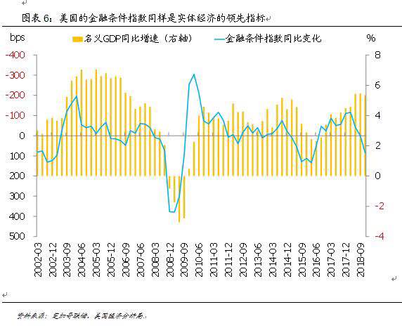 美国的货币当局通常使用“价”作为货币政策调节的准绳,即通过基准利率的调节,来为宏观经济创造松紧适度的货币环境。但和我们在中国市场发现的规律类似,美国市场的金融条件同样是实体经济的领先指标。