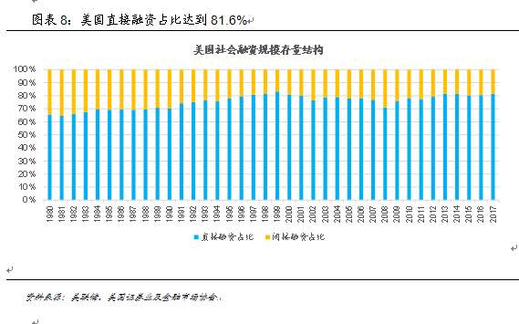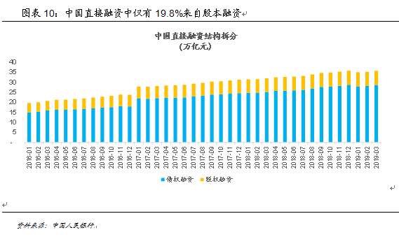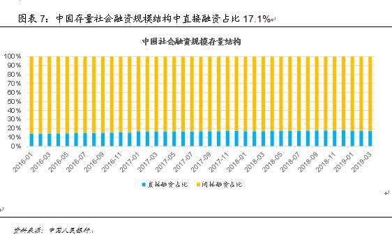由于中国的经济发展路线属于典型的转轨经济,因此商业银行主导了整体融资体系,我们采用存量的社会融资规模测算结构,截至2019年一季度末,中国存量社融结构中直接融资占比为17.1%,即静态地看,82.9%的金融资源是通过商业银行等金融中介进行配置的。相较而言,美国的存量社会融资规模结构中直接融资占比在2017年已经达到81.6%,这也是中美两大经济体在金融资源整体配置上的最大不同。
