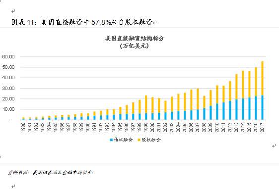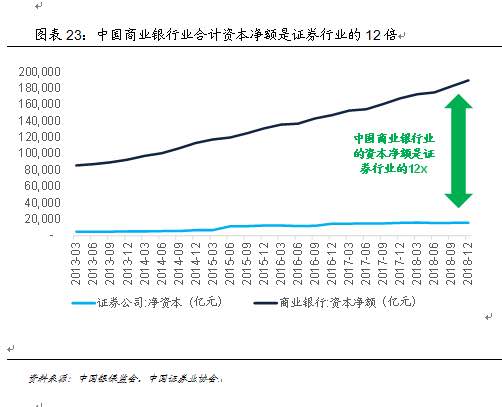 科创板等政策能够较好地提升股本融资的占比,但需要注意的是,科创板将推行保荐机构的跟投制度,以完善保荐机构的风控要求。这一要求直接将投资银行业务转化成重资本业务,而中国的金融体系以商业银行为主导,商业银行业的资本实力远强于证券公司,截至2018年底,中国商业银行业合计资本净额为证券行业的12倍。如果适当放松混业监管要求,允许商业银行从事证券业务,则有望凭借强大的资本优势,快速做大直接融资规模。