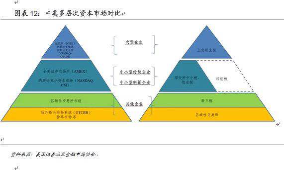 相较而言,中国的多层次资本市场建设较为缓慢,2004年设立中小板,开始尝试放松企业上市制度以实现资本市场扩容;2009年设立创业板,定位于面向科技行业企业的场内交易市场,正式拉开了中国多层次资本市场建设的序幕。