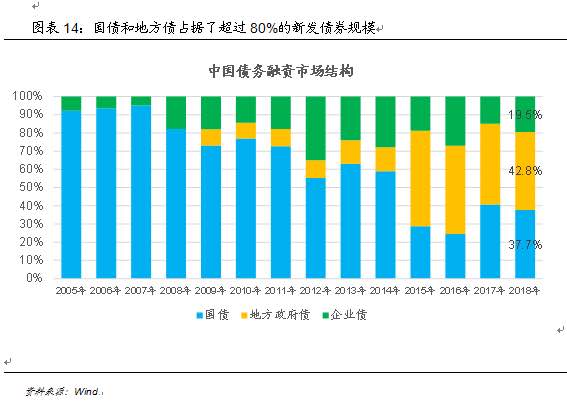 如果进一步拆分中国的债务融资市场可以看到,这一市场的资源供给也表现出不平衡,国债和地方政府债是中国债务资本融资占比最高的主体,以2018年为例,国债和地方政府债券分别占据了37.7%和42.8%的新发债券规模,以非金融企业为主体的债务融资规模仅占据不到20%。