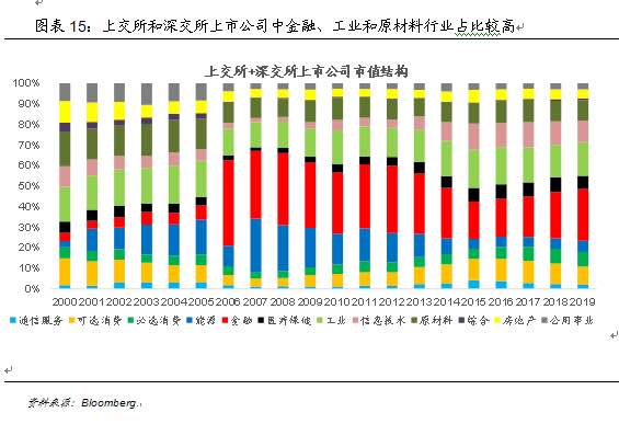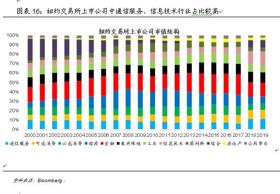 上交所和深交所上市公司中,金融、工业和原材料行业上市公司市值占比显著高,分别高出同样主要面向传统经济行业的纽约交易所10.8%、9.2%、6.2%,而纽约交易所上市公司中通信服务、信息技术两大行业市值占比较高,分别高出中国市场9.0%和4.6%。