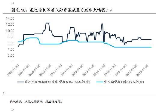 以信托贷款为例,可以以贷款类信托产品预期年收益率作为这一渠道融资成本的代理变量,但需要说明的是,实际成本将更高,因为信托公司等融资中介需要赚取利润空间。以3~5年期产品为例,通过贷款类信托融资成本平均在7.25%,高出同期限商业银行贷款利率250个基点。