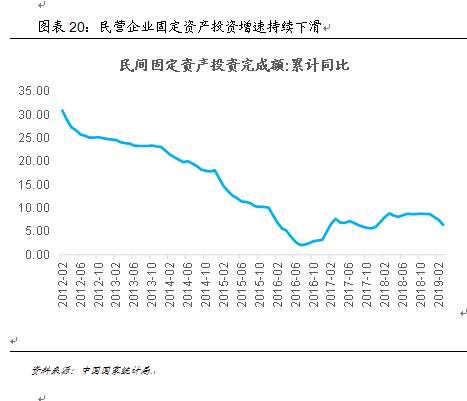 2018年以来,这一市场利率在15%~16%之间窄幅波动,几乎是传统商业银行体系资金成本的4~5倍,中国的小微企业和民营企业投资的回报率(ROIC)必须高于如此高昂的资金成本才能盈利,而这几乎不可能,因此小微企业和民营企业的投资热情逐年下降。根据国家统计局披露数据,民间固定资产投资增速不断下滑,截至2019年3月已经下滑到6.4%。