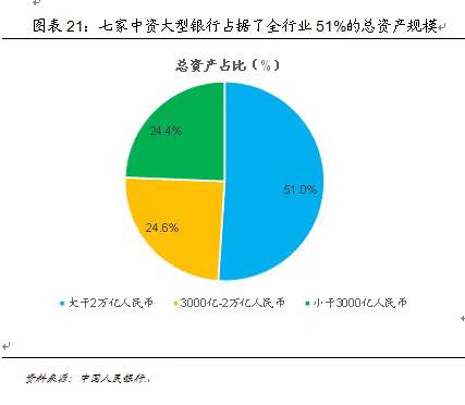 中国的商业银行体系表现出较为明显的结构分化,根据央行披露数据,七家大型国有银行占据了全行业51%的总资产规模。
