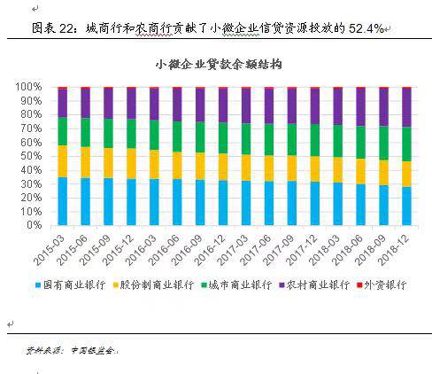 但从整体上看,大型国有银行不是对民营和小微企业的信贷支持的主体,截至2018年底,全行业小微企业贷款余额中,来自城商行和农商行的投放比例分别达到24.8%和27.6%。