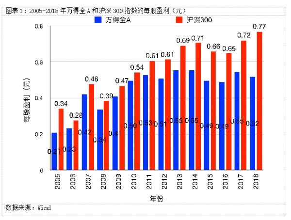 图表1列出了2005-2018年间万得全A和沪深300指数的每股盈利(元)。指数的每股盈利等于成分股的盈利之和除以成分股的总股本之和。