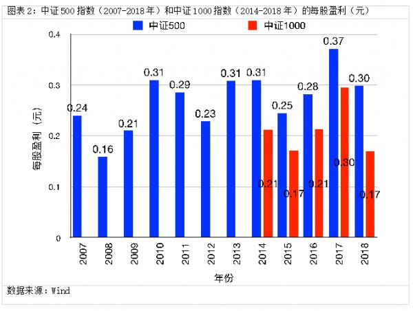 图表 2列出了中证 500指数(2007-2018年)和中证1000指数(2014-2018年)的每股盈利。