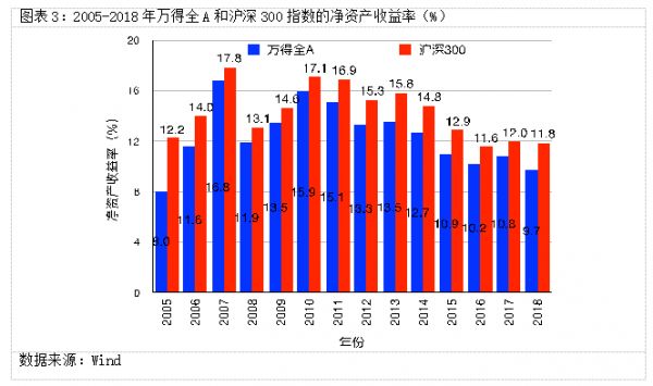 图表3列出了2005-2018年万得全A与沪深300指数的净资产收益率(%)。指数的净资产收益率是成分股的净利润之和除以对应的净资产之和。