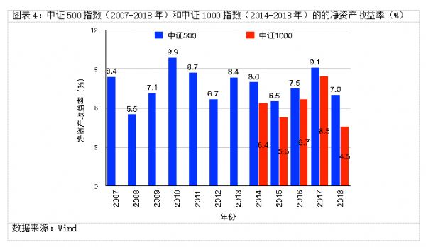 图表 4列出了中证 500指数(2007-2018年)和中证 1000指数(2014-2018年)的净资产收益率。