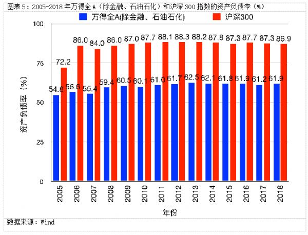 图表5列出了2005-2018年万得全A(除金融、石油石化)和沪深300指数的资产负债率(%)。指数资产负债率等于成分股的负债之和除以相应的总资产之和。