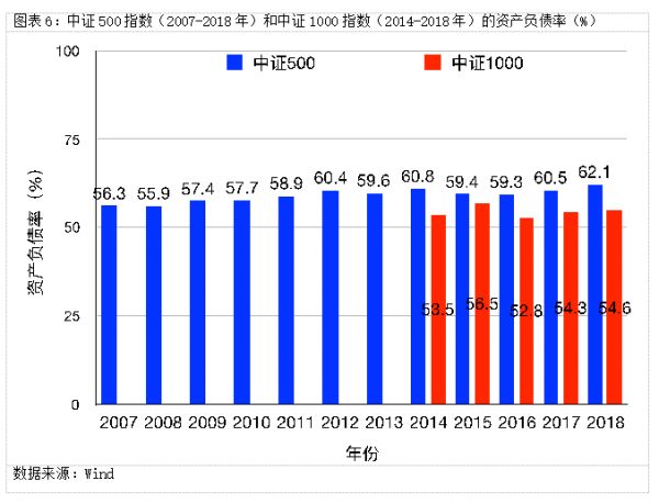 中证500指数的资产负债率与万得全A(除金融、石油石化)的水平相当,都在60%左右且在2007-2018年间都变化不大。