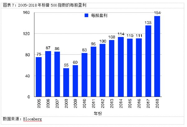 图表7列出了标普500指数在2005-2018年间的每股盈利。标普500指数的每股盈利等于成分股的每股盈利乘以对应的调整因子的和,调整因子与成分股的流通股数有关。标普500的每股盈利除以10就大致等于用沪深300指数的计算方法得到的每股盈利。