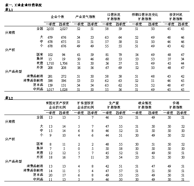 一季度产业景气扩散指数为52,呈轻度扩张态势。这是产业经济自2014年本调查开始以来首次出现的且持续五个季度的扩张。经营状况持续改善,扩散指数为58,乃四年内的高位(上季度为59);反映投资热情的扩散指数与上季度相同,为45,虽低于荣枯点,但仍处历史高位。