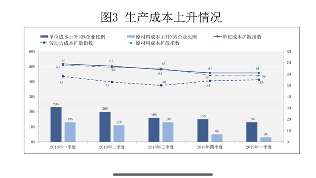 本季度单位成本继续上升(扩散指数为61),但程度有所缓和,表现在有较大幅成本上升(单季成本上升超出5%)的企业占比继续下降,从上季度的3%降为1%。