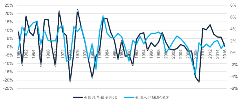从美国的经验看,乘用车销量的走势与经济同样高度一致,同时表现出一年左右的滞后性,例如在2008年全球金融危机造成经济负增长后,2009年汽车销量延续了负增长,直到2010年才重拾增长。