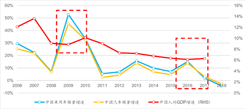 受到国内金融去杠杆和外部贸易摩擦冲击,中国经济增长在2018年承压,消费者对于经济和收入前景较为悲观,从而对汽车购置决策采取更加谨慎的态度。从美国和韩国较长时间范畴的历史数据看,汽车的消费量增长与经济景气程度呈现高度相关,走势基本一致,同时汽车销量对经济走势有小幅滞后性。