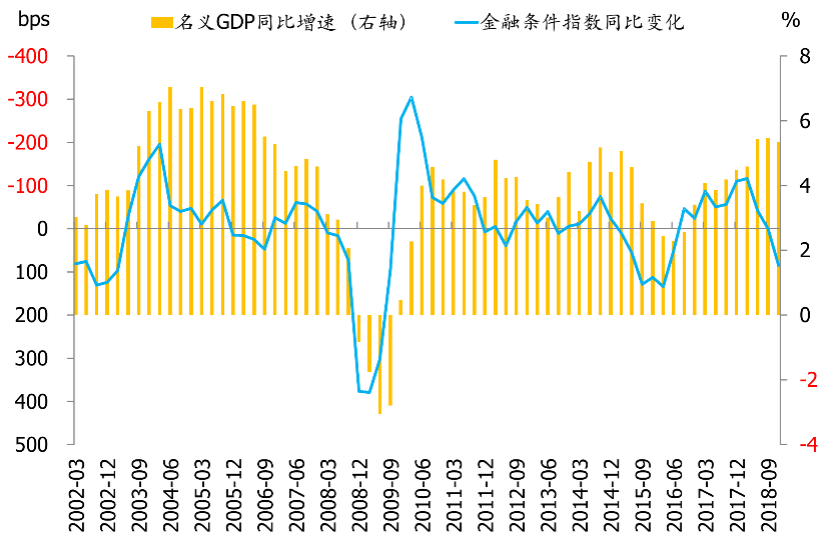 美国的货币当局通常使用“价”作为货币政策调节的准绳,即通过基准利率的调节,来为宏观经济创造松紧适度的货币环境。但和我们在中国市场发现的规律类似,美国市场的金融条件同样是实体经济的领先指标。基于经济整体融资的结构,芝加哥联储等计算了适用于美国的国家金融条件指数,这一指数主要包括三大指标:1)10年期美国国债收益率;2)BBB级企业债券信用利差;3)标普500指数估值,分别对应低信用风险主体债务融资成本、高信用风险主体债务融资成本和股本融资成本。整体上看,美国的金融条件指数同样是实体经济的领先指标,金融条件指数的变动对美国名义GDP的变动具备较好的领先性,时滞大约在1-2个季度。