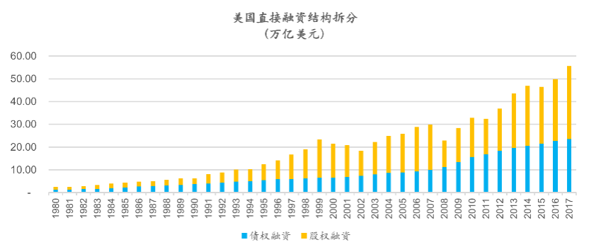 由于中国的经济发展路线属于典型的转轨经济,因此商业银行主导了整体融资体系,我们采用存量的社会融资规模测算结构,截止到2019年一季度末,中国存量社融结构中直接融资占比为17.1%,即静态地看,17.1%的金融资源是通过商业银行等金融中介进行配置。而相较而言,美国的存量社会融资规模结构中直接融资占比在2017年已经达到81.6%,这也是中美两大经济体在金融资源整体配置上的最大不同。