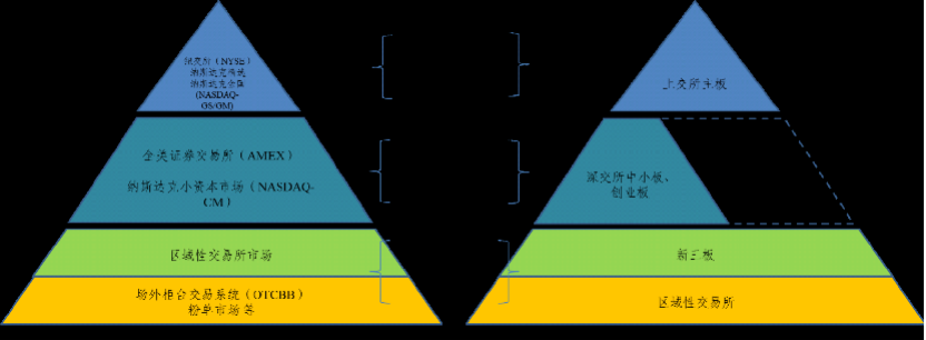 中国欠发达的境内资本市场是股本融资规模难以得到快速发展的重要原因。美国已经形成了高度成熟的多层次资本市场体系,较为成熟的大型企业可以通过纽交所和纳斯达克等交易所进行融资,对于中小型企业,则可以选择小型的区域交易所进行融资,此外还有场外柜台交易系统、粉单市场等可供选择。相较而言,中国的多层次资本市场建设较为缓慢,2004年设立中小板,开始尝试放松企业上市制度以实现资本市场扩容;2009年设立创业板,定位于面向科技行业企业的场内交易市场,正式拉开了中国多层次资本市场建设的序幕。但截至目前,这一探索没有取得良好成效,创业板并没有在定位上和主板体现出差异性。例如从创业板上市公司的市值结构看,制造业企业占据了创业板62%的市值和约70%的上市公司家数,并没有体现出明显的科技企业融资市场定位。