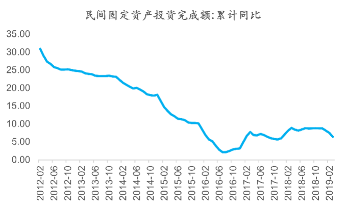 更有甚者,部分民营企业和小微企业因为担保和抵押品缺失问题,只能从融资成本更高的市场进行融资,例如民间借贷。温州市金融办披露的温州地区民间融资综合利率可以作为此类民间借贷成本的代理变量,一窥从这一市场融资企业的成本。2018年以来,这一市场利率在15-16%之间窄幅波动,几乎是传统商业银行体系资金成本的4-5倍,中国的小微企业和民营企业投资的回报率(ROIC)必须高于如此高昂的资金成本才能盈利,而这几乎不可能,因此小微企业和民营企业的投资热情逐年下降。根据国家统计局披露数据,民间固定资产投资增速不断下滑,截止到2019年3月已经下滑到6.4%。