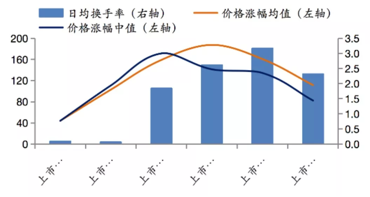 2018年,A股上市5日后的区间涨幅均值与中值分别为102.94%和110.81%(上市后5日的收盘价相对于开盘价的涨跌幅,即包含IPO首日涨幅),上市5日内的日均换手率为0.029%,交易活跃程度依然不高。IPO后30日涨幅均值达到187.64%,30日内的日均换手率回升至2.61%,与2018年A股日均换手率基本相当(A股2018年日均换手率为2.31%)。上市2个月后,涨幅均值为160.79%,换手率继续提升至3.17%。之后涨幅有所回落,上市后180日区间内的涨幅均值下降至111.49%,中值降至82.35%。