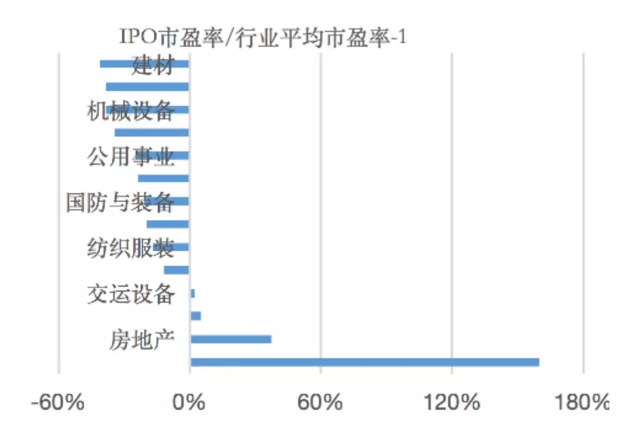 2014年1月12日,证监会发布《关于加强新股发行监管的措施》,对发行新股的市盈率进行了一定限制,规定发行人应明确所属行业,并以中证指数发布的一个月静态平均市盈率作为定价参考,如果发行市盈率高于行业均值,需补充说明其风险因素。因此,A股IPO市盈率基本在17-22的区间内,一般不超过23(金融类IPO企业市盈率较低,如中信建投11.21、紫金银行10.85、中国人保8.87等),公司差异与行业差异均不显著。计算2018年IPO的行业平均市盈率,进一步用“IPO行业平均市盈率/对应行业平均市盈率-1”衡量首发市盈率偏离行业平均市盈率的程度,见图3。建筑行业的IPO企业中,中铝国际与新疆交建首发IPO分别为31.86和22.00,均高于建筑行业的平均市盈率(10.42),中铝国际也是2018年首发市盈率最高的IPO。而其他行业首发市盈率均要比行业IPO均值低30%左右,IPO抑价较为严重的行业包括食品饮料(该行业IPO首发市盈率均值/行业平均市盈率-1=-50.58%)、信息技术(-50.84%)、休闲、生活及专业服务(-61.48%)。