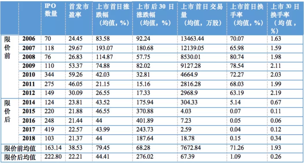 为了回答这一问题,我们不妨对比分析A股IPO限价前后的市场概况。由于2005年5月至2006年A股IPO暂停一年,进行股权分置改革。为保证考察区间内市场状态的延续性,采用2006年至2012年数据作为IPO限价前阶段(2013年IPO暂停),2014年至2018年作为限价后阶段。