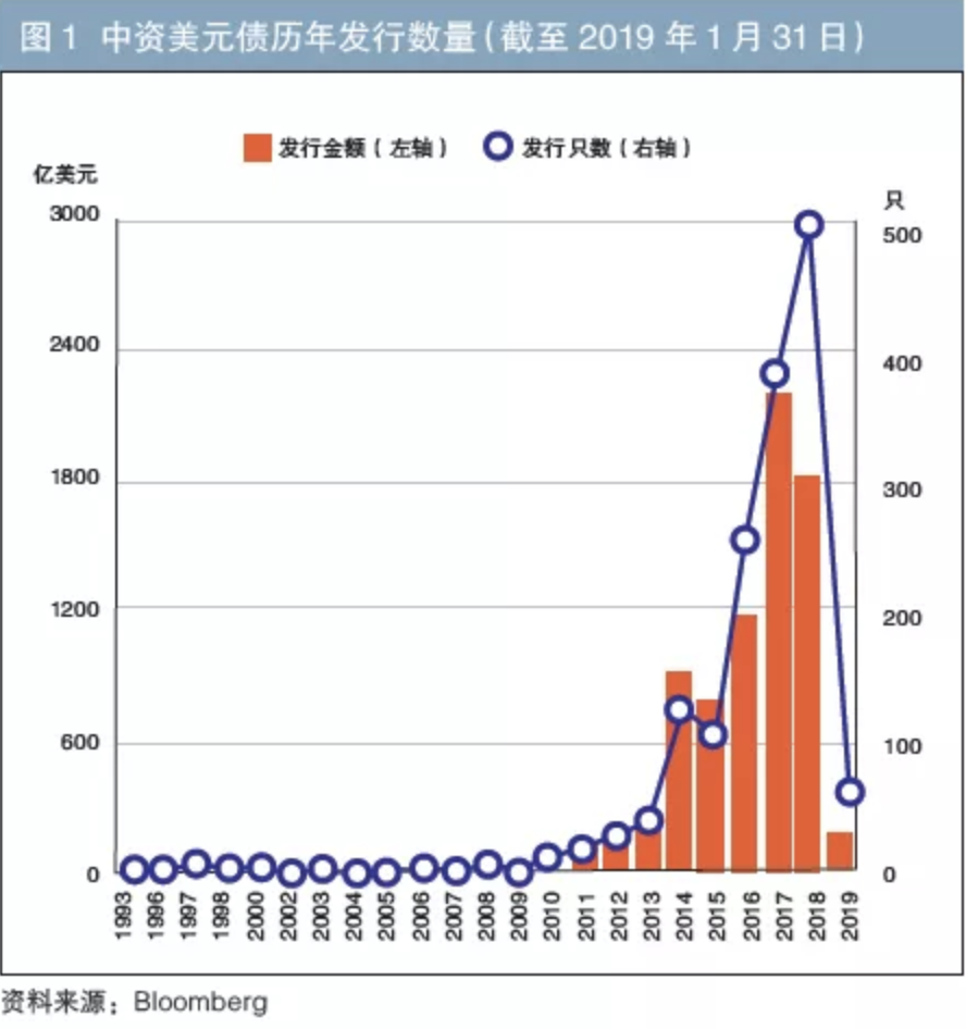 中资美元债的发行规模在2017年达到历史高点后,在2018年有所回落,发行期限趋短,发行企业资质转差,同时发行利率也走高。2019年美联储加息进程或将放缓,美债收益率有望整体下移,这可能会给中资美元债市场带来机会。另外,中资企业境外发债监管或有所放松,预计2019年中资美元债的发行规模仍然较大。2019—2023年将迎来存量美元债还本付息高峰。