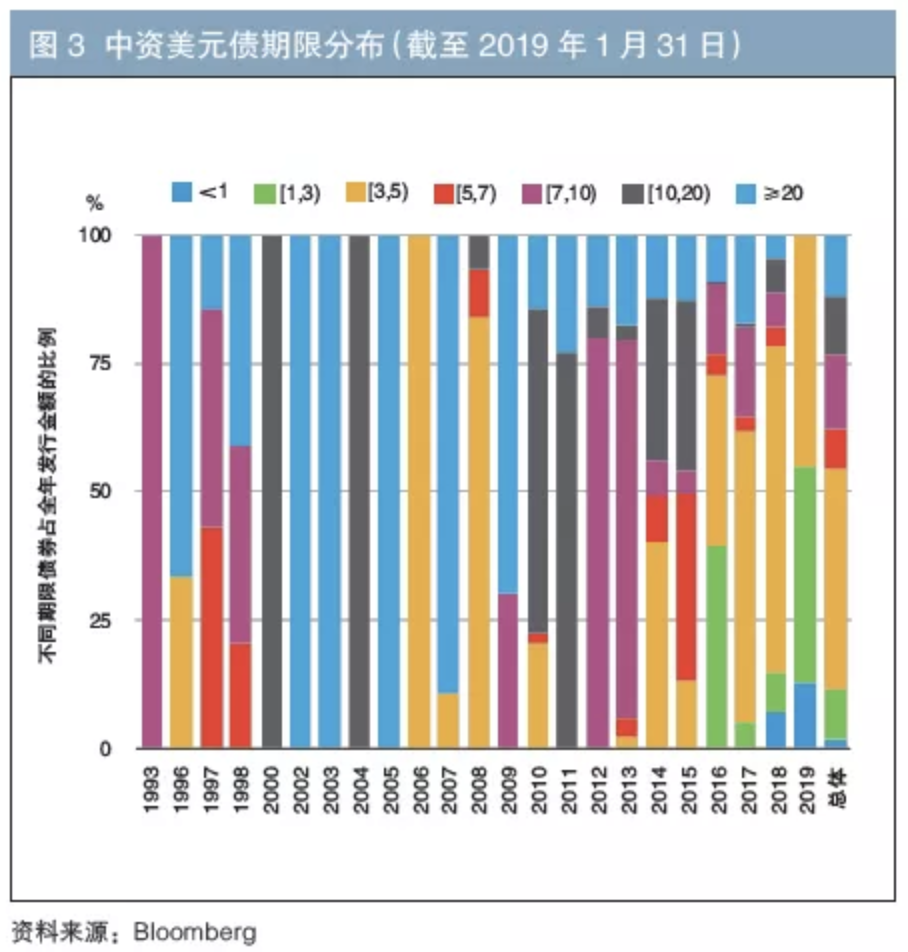 美元债的发行期限分布较广泛,且有变短的趋势。从总体上看,5年期以下的中短期债和5年期以上的中长期债券发行规模大体相当,前期主要以中长期债券为主,后期逐渐转向中短期债券(见图3)。2010年以前,中资美元债的发行规模小,发行期限也多以7年期以上的长期债券为主。自2010年起,中资美元债发行提速,发行期限也逐渐向5~7年期和5年期以下的中短期债券偏移。从2016年开始,5年期以下的中短期债券发行开始提速,尤其是1~5年期债券在近几年增长明显,2016年和2017年发行的1~5年期中资美元债金额占比分别为73%和61%,2018年该占比再次突破70%。