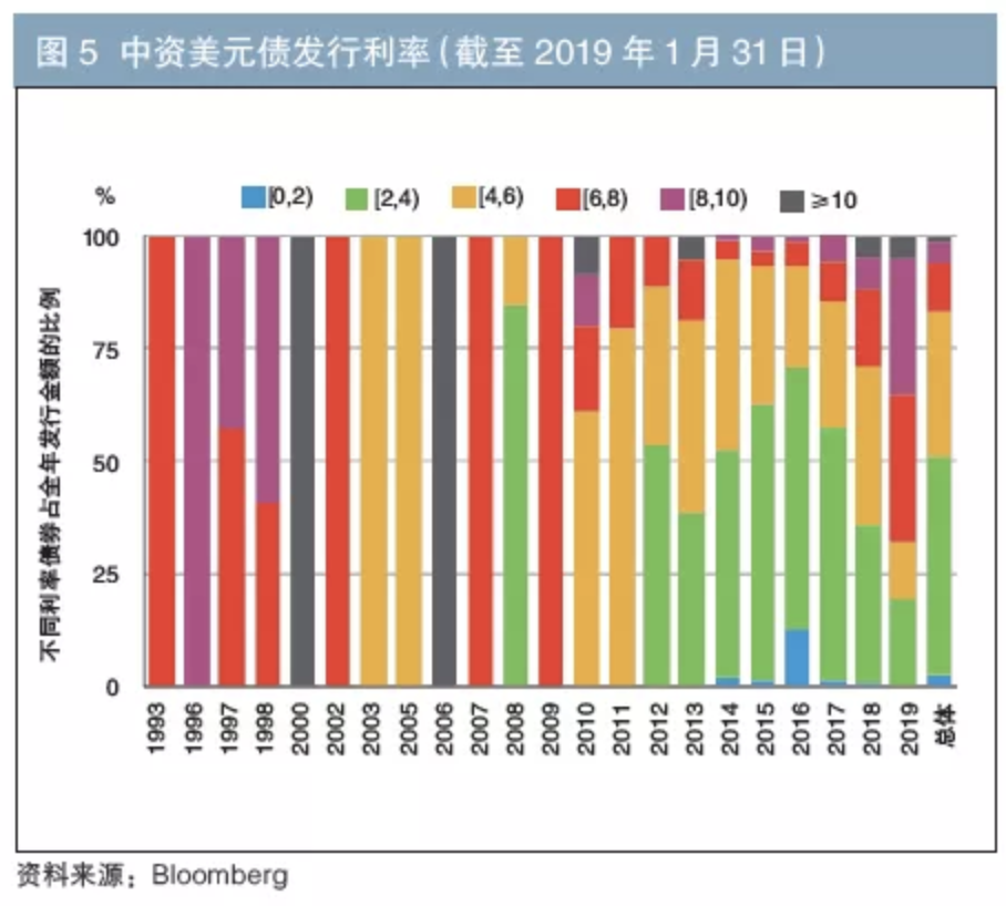 在2012年以前,中资美元债的发行利率偏高。从2012年开始,中资美元债的发行利率整体下行,但2016年以来又整体上行。从发行金额来看,截至2019年1月31日,发行利率位于2%~4%的中资美元债占比约为48.4%,发行利率位于4%~6%、6%~8%的占比分别为32.4%、10%,发行利率低于2%的占比约为2.8%,发行利率高于8%的占比约为6.4%(见图5)。