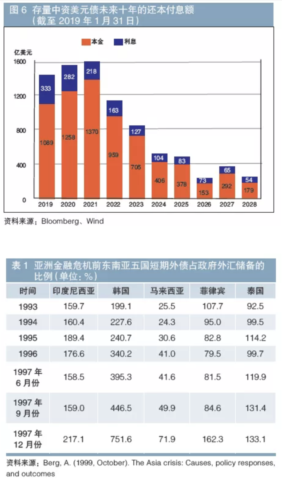 中资美元债到期所带来的外汇需求压力将有多大?会不会给中国经济带来系统性风险?可以结合1998年亚洲金融危机发生前的东南亚国家案例进行分析。表1计算了1993—1997年印度尼西亚、韩国、马来西亚、菲律宾与泰国这五国短期外债占政府外汇储备的比例。在危机发生前,这五个国家短期外债占外汇储备的比例都偏高。短期外债偿还压力最大的是韩国,其短期外债占外汇储备的比例长期在接近200%以上,且逐年升高,从1993年的199.1%飙升到了1997年的751.6%。即便是短期外债偿还压力最小的马来西亚,其短期外债占外汇储备的比例在危机爆发前也达到了71.9%。从宏观上看,在未来几年中,中资企业每年需要偿还存量美元债的本息金额均不超过1600亿美元,这一规模大概是我国政府近3万亿美元外汇储备的5.3%。因此,笔者认为中资美元债不构成一个系统性风险因素,不会给中国经济带来系统性金融风险。