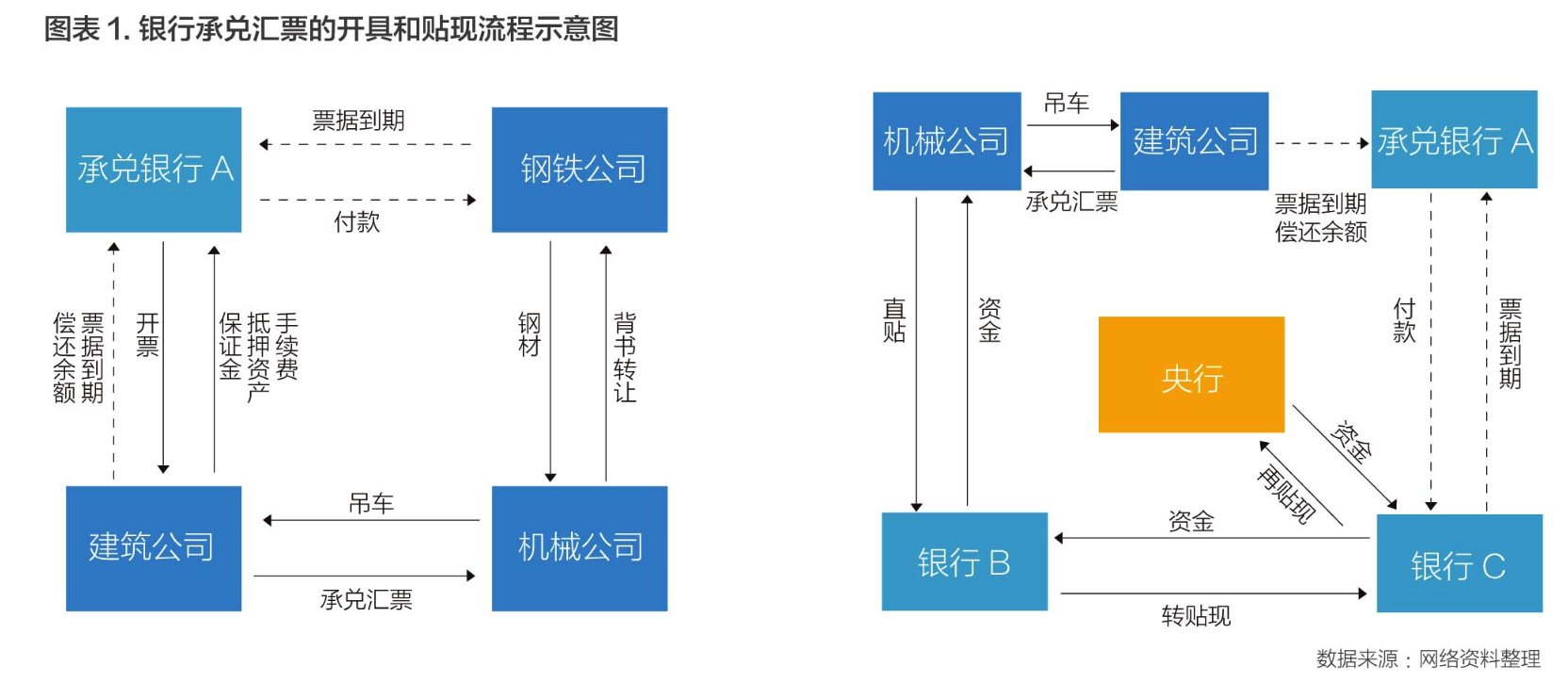 图表1右栏,则是机械公司到银行B处直接贴现(也称贴现、直贴),银行B支付机械公司1900万元现金,获得面额2000万的承兑汇票,其中100万元差额是贴现利息(因为票据一年后才到期),持有半年后,由于流动性紧张,在银行同业市场将票据以1950万元转让给流动性宽裕的银行C(转贴现),后者持有到期可从承兑银行A获得2000万元现金,建筑公司则偿还除保证金外对银行A的1000万元敞口。银行C若临时急需资金,可向银行D转贴现或向央行“再贴现”。