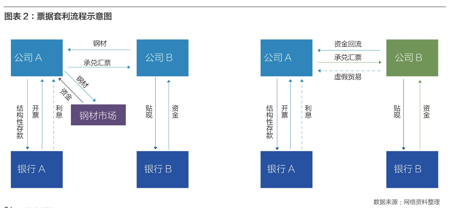 敏锐的公司迅速捕捉到机会窗口,开始蜂拥至银行开票套利。流程参照图表2左栏:以钢贸易为例,公司A可率先将资金存至银行A,做1笔1亿元的一年期的结构性存款,收益率为4%左右,年化收益为400万元,银行开具一张1亿元的承兑汇票,收款人为公司B。