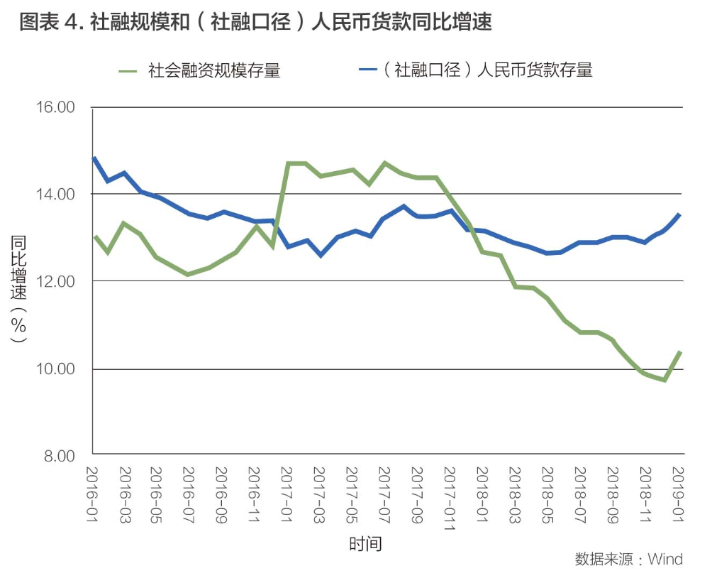 随着稳健货币政策的微调,社会融资和(社融口径)人民币贷款大幅增长。如图表4所示,2019年1月,社融存量增速回升至10.4%,是2017年7月社融增速、单边下行以来的首次企稳;(社融口径)人民币贷款存量增速反弹至13.6%,是2017年11月以来的最高增速。