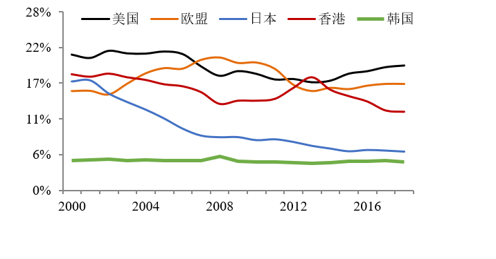 香港在中国改革开放历史进程中发挥了重要的经济功能,是内地联系国际市场的主要窗口。贸易视角下,香港是大陆重要的贸易伙伴,以双边贸易额占中国对外贸易总额的比重来衡量,2018年大陆与香港的双边贸易额为3105.59亿美元,占中国进出口总额(46230.4亿美元)的比重为6.72%,仅次于欧盟(6821.64亿美元,14.76%)、美国(6335.19亿美元,13.70%),与日本(3276.63亿美元,7.09%)、韩国(3134.28亿美元,6.78%)相当。从出口角度看,香港在双边贸易中的作用则更为重要。2018年大陆对香港的出口额为3020.68亿美元,占大陆整体出口额(24874亿美元)的比重为12.14%。香港一直是大陆重要的出口对象,2000年大陆向香港的出口占大陆出口总额的17.86%,之后随着大陆加入WTO,与其他国家和地区的贸易逐渐活跃,香港在出口中的占比有所下降。