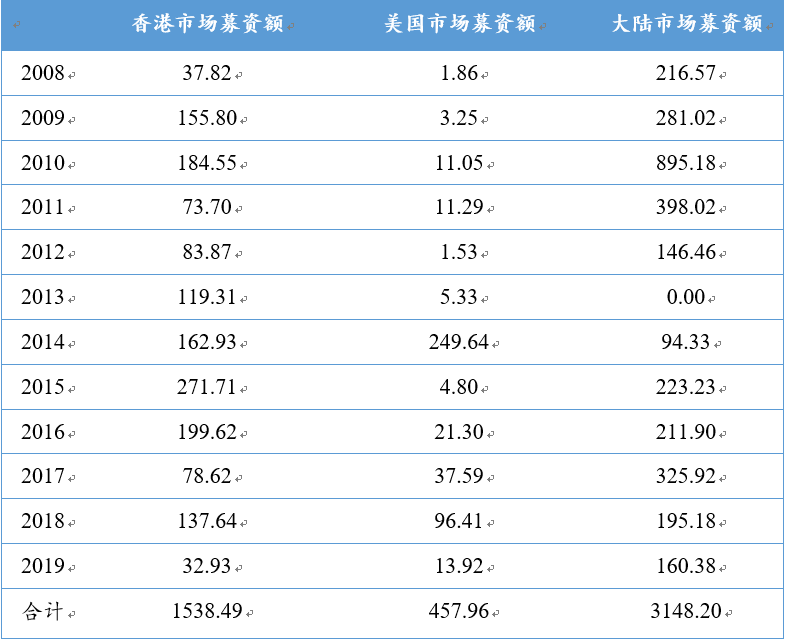 图表4 中国企业在不同资本市场IPO募资情况分析(亿美元)
