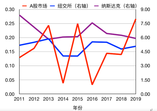 图表1:2011-2019年A股、纽交所、纳斯达克的退市率(%)