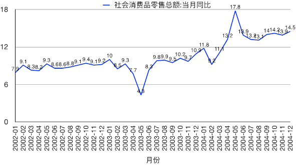 图表1:2002-2004社会消费零售总额当月同比增速(%)