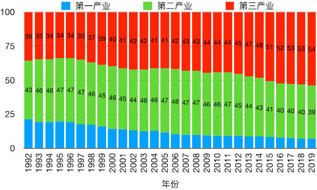 还有一点不同的是经济结构也不一样了。在2003年,第一、二、三产业占GDP的比例分别是12.4%、45.6%、42.0%;在2019年,这三个比例分别是7.1%、39.0%、53.9%。第三产业占比增加了近12%。