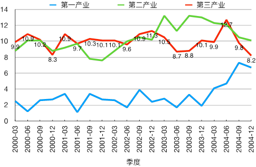 “非典”对第二、三产业的冲击是要大于第一产业的,且第一、二产业恢复速度要高于第三产业。与2003年1季度相比,三产在2季度的增长率分别下降了1.1%、1.9%、1.8%。第一、二产业在3季度就恢复了增长,而第三产业在4季度才恢复到接近于1季度的增长速度。