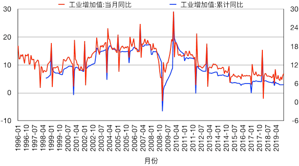 图表5:1996年至2019年规模以上企业工业增加值同比增长率(%)