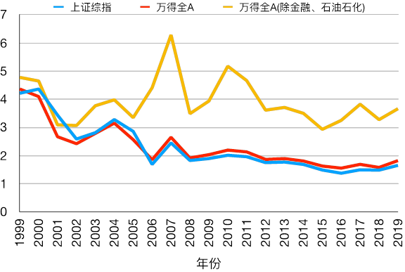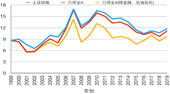 图表6和7分别是1999年至2019年上证综指、万得全A、万得全A(除金融、石油石化)三个指数的ROA和ROE,其中2019年的值由2019年3季度值年化而来(即3季报值乘以4/3),与实际值可能会有出入。