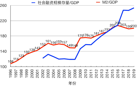 图表9:社会融资规模存量和M2占GDP的比例(%)